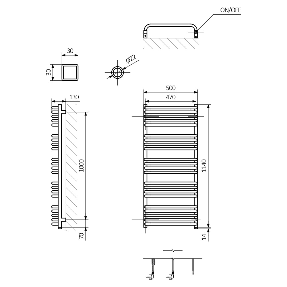 Alex One - White Electric Towel Rail H1140mm x W500mm 600w Thermostatic