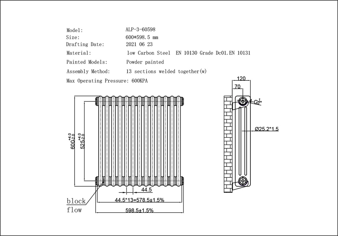 Pipe Centres: 598.5mm + Valves