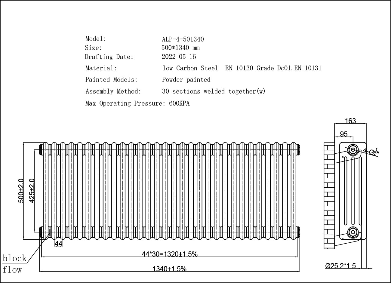 Pipe Centres: 1340mm + Valves