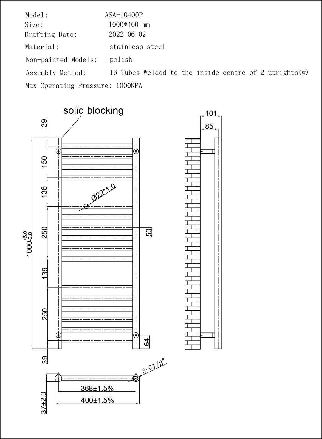 Aston - Stainless Steel Heated Towel Rail - H1000mm x W400mm - Straight