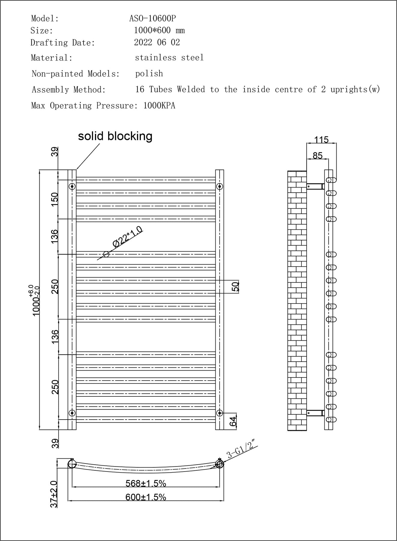 Aston - Stainless Steel Heated Towel Rail - H1000mm x W600mm - Curved