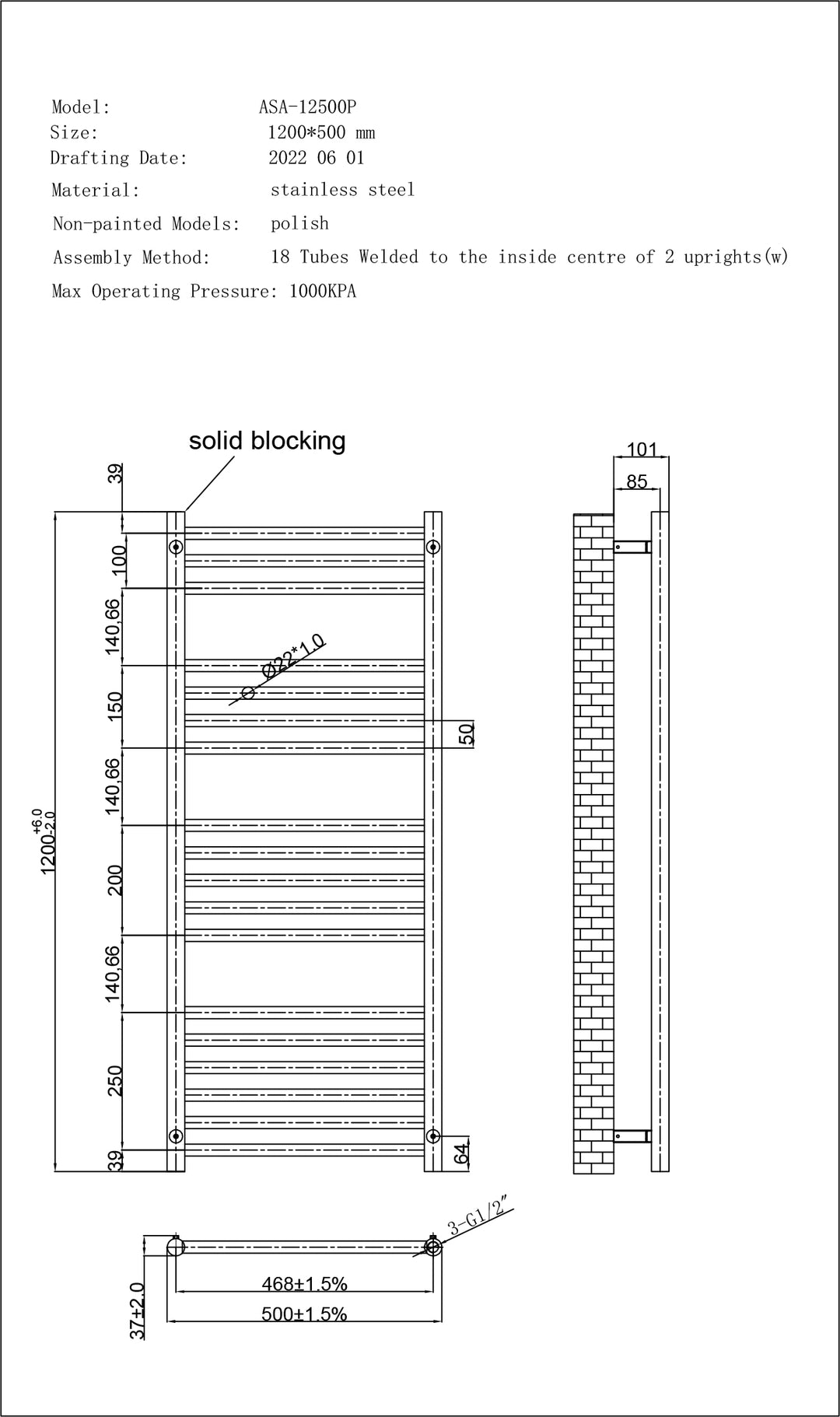Aston - Stainless Steel Heated Towel Rail - H1200mm x W500mm - Straight