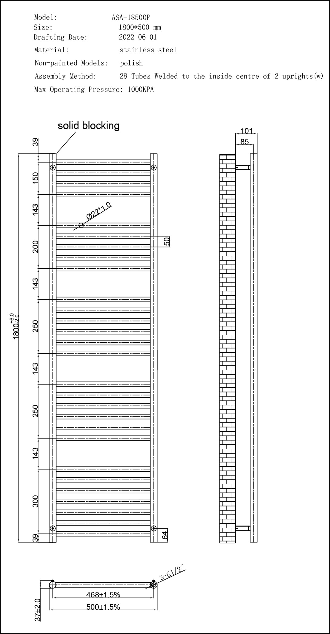 Aston - Stainless Steel Heated Towel Rail - H1800mm x W500mm - Straight