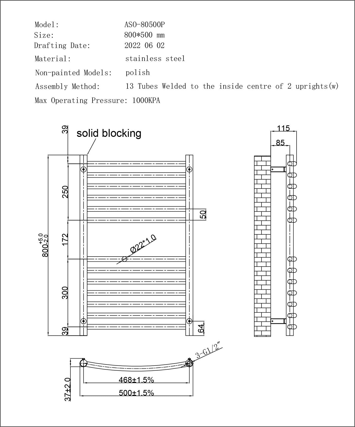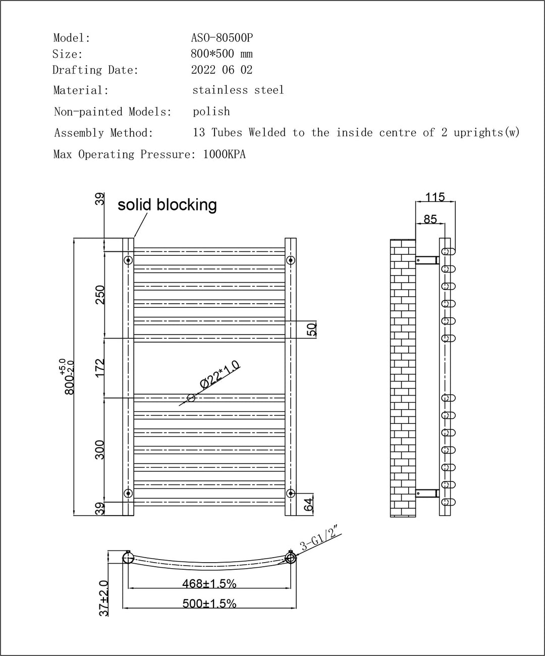 Aston - Stainless Steel Heated Towel Rail - H800mm x W500mm - Curved