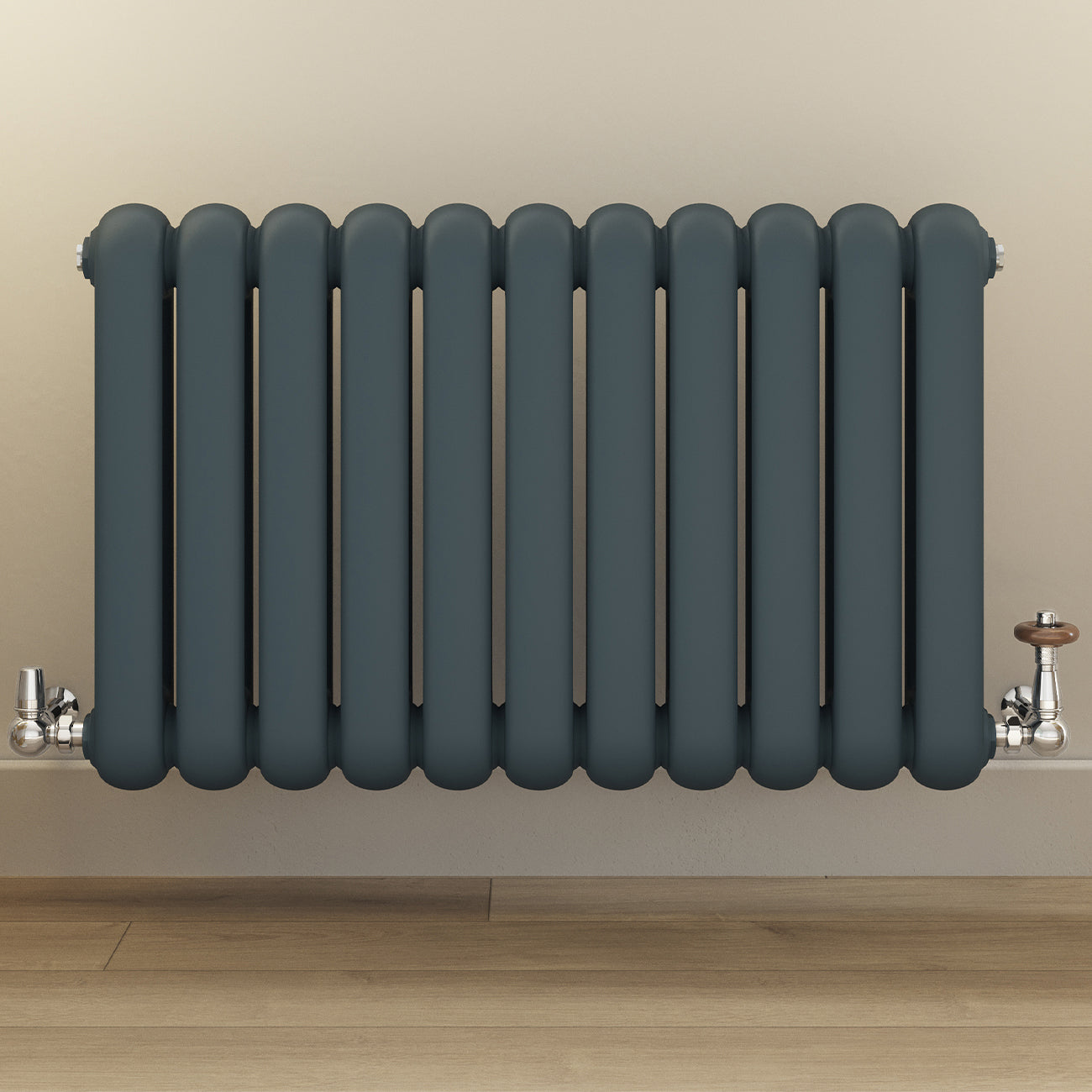 - Pipework comes out of the wall and the radiator has connections at the bottom.