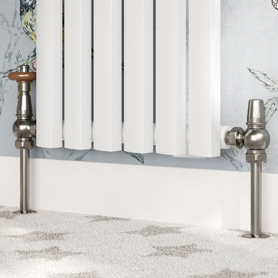 - Pipework comes out of the wall and the radiator has connections at the bottom, but the valve itself will protrude in front of the radiator, so where this is the case, we recommend corner radiator valves.