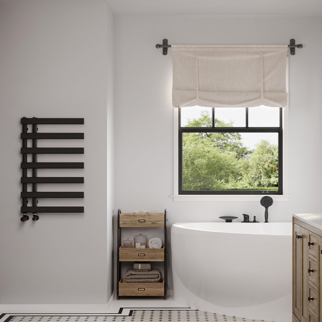 ColourBlack, the colour that always fits and never fades. This matt black powder painted towel rail is exactly what your home needs. Black radiators go well with anything. As a colour, there are few shades or hues that it does not complement. Whether providing effective shadow tones to an already dark background, or a striking contrast to more brightly coloured walls, black towel rails rarely look out of place. As well as suiting a great variety of home styles, black is a very forgiving shade. It won't show dust, dirt, or rust like white so you know they will look great well into the future.
