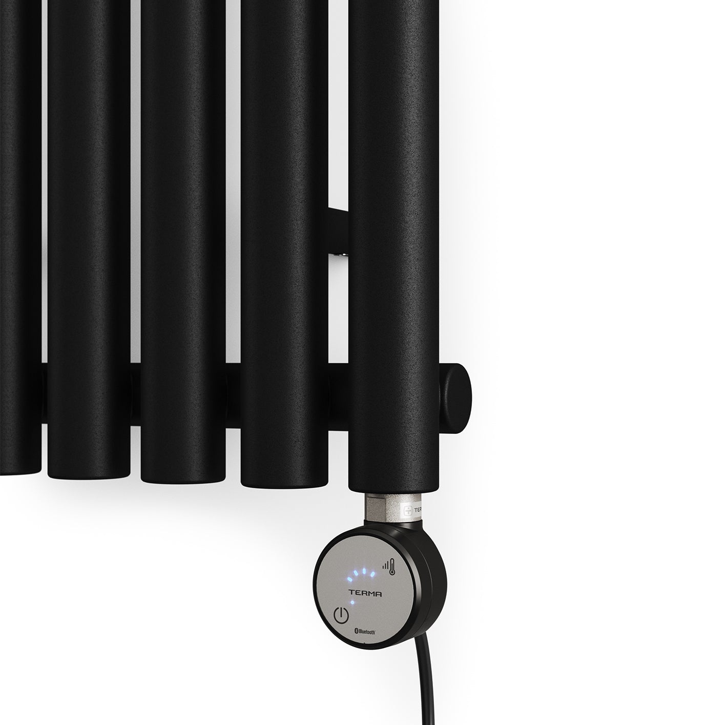 Terma oil filled electric radiator supplied with the Terma MOA Blue (bluetooth) heating element - smartphone controlled, fully thermostatic element and a round clock face style head. Full operational control on smartphone/tablet via Bluetooth (up to 10 metre range depending on your walls), with a choice of internal temp (30°c to 60°c) or ambient room temp (15°c to 30°c) regulation. Once programmed the element will remembber settings when phone is not in Bluetooth range. 7 day Timer functionality. Also includes 2hr drying function whereby radiator will turn off automatically when time has elapsed. The Heban Black colour from Terma has a matt, rough texture. This type of colour/finish is unique for electric radiators. Terma offers a 150x50mm colour chip of this finish should you wish to see the colour prior to purchase. The heating element will be provided separately in the box and simply needs screwing into place in the radiator at time of installing - can be fitted on the left or right side as preferred. The cable length is 1.5 metres. The Terma BlueLine app is free to download, available for IOS and ANDROID. Casing and cable on element will match the radiator colour (white/silver/black). IPx5 (safe for use in bathroom). Class 1. CE Approved. Trades can wire this in within 20-30 minutes. Note: This radiator is a portrait (vertical) model and cannot be installed horizontally, as it will not function correctly horizontally. Rolo is part of a unique family of products where you can buy matching radiators (electric and central heating), mirror radiators and towel rails.