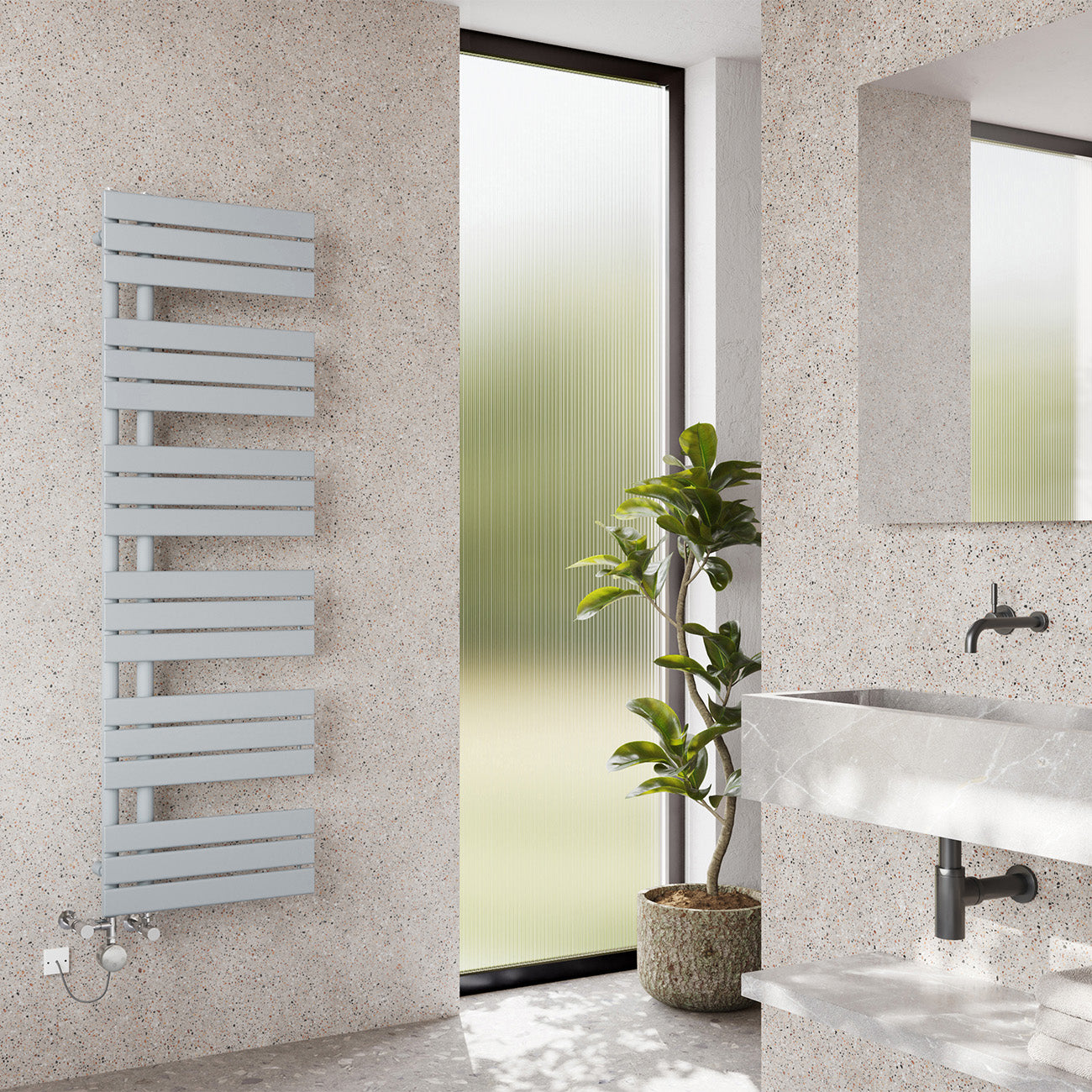StyleA popular pick for those looking to add a touch of design to their bathroom, the flat tube style offers a slimline feel that will work with pretty much any décor. The Tristan has horizontal flat tubes, grouped in threes, which are connected to two vertical round tubes (these are called collectors) on one side of the towel radiator. It is completely reversible, meaning you can have the collector tubes (the vertical ones) on the left or right hand side. This open-ended design makes guiding towels on and off super easy. The powder painting gives the metal a perfectly even finish and It’s easy to maintain and clean – get those towels nice a toasty for when you step out the shower!